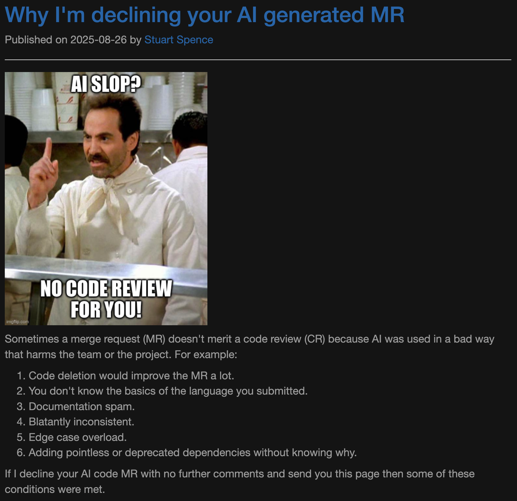 资深计算机科学家 Stuart Spence 在个人博客发文,解释了他为何会直接拒绝由 AI 生成的低质量代码合并请求(Merge Request, MR)。他将这类低质产出称为 “AI slop”,认为其不仅浪费审查者时间,还可能破坏项目质量。