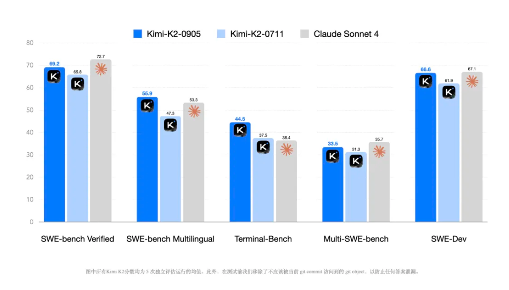 在侧重考察真实软件工程任务的 SWE-bench Verified 等基准测试中,新版 Kimi K2 模型的表现如下: