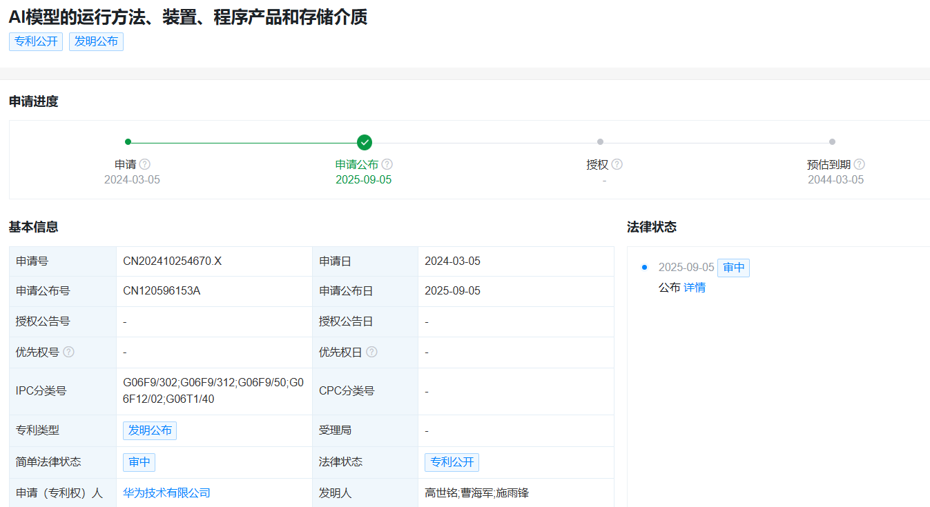 天眼查 App 资料显示,华为技术有限公司申请的“AI模型的运行方法、装置、程序产品和存储介质”专利于 9 月 5 日公布。