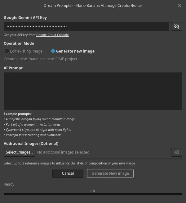 该插件支持用户在 GIMP 内直接通过文字提示生成新图像,或对现有图像进行自然语言编辑,无需切换到外部工具。使用 Dream Prompter 需绑定启用计费的 Google Gemini API key,插件本身已开源并托管在 GitHub。