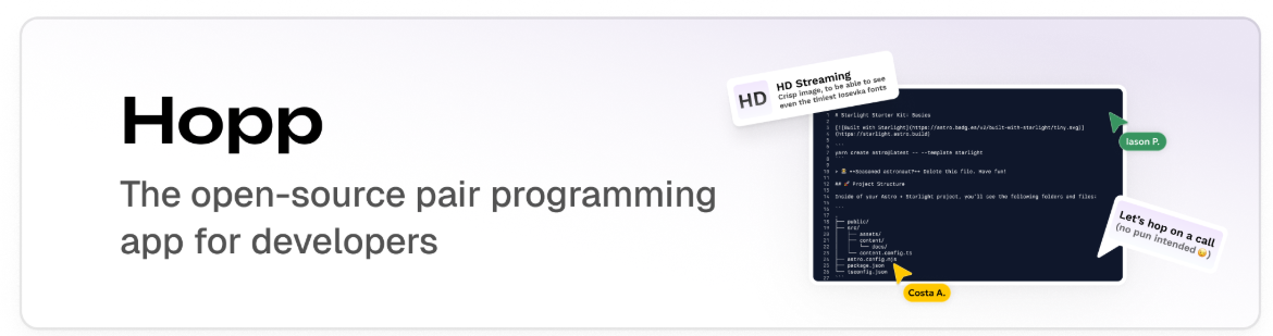 Hopp 是一款开源结对编程应用,可让你与队友结对编程。该应用使用 Tauri 构建,WebRTC 基础架构由LiveKit提供支持。
