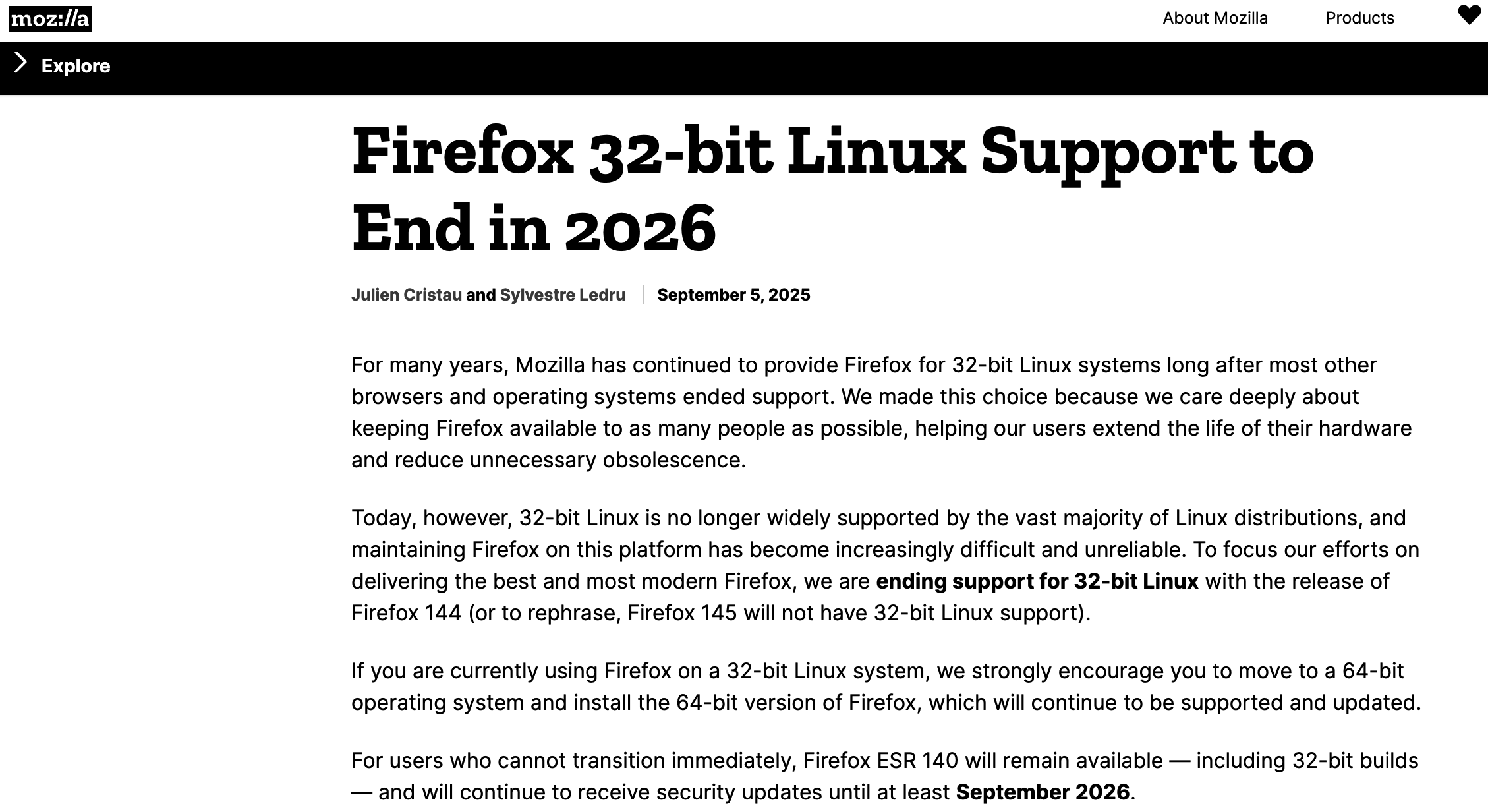 Mozilla 宣布 Firefox 144 版本(预计发布于 2025 年)是最后一个仍支持 32 位 Linux 的版本。自 Firefox 145 开始,将不再提供对 32 位 Linux 的支持。