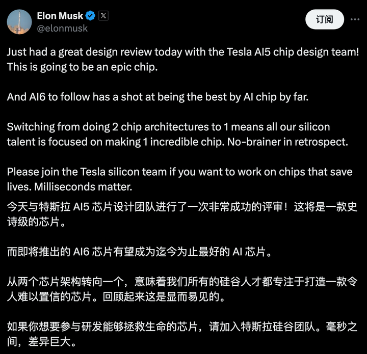 马斯克在社交媒体宣布,接下来的 AI6 有望成为迄今为止最好的 AI 芯片。