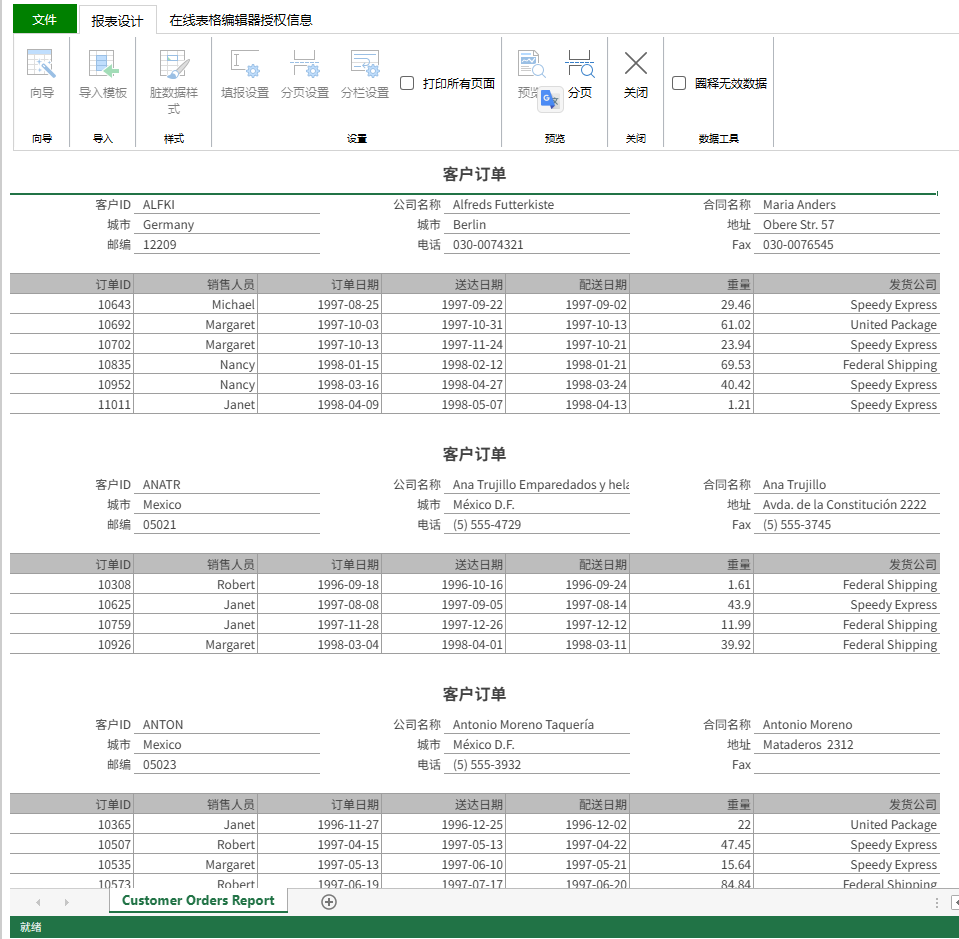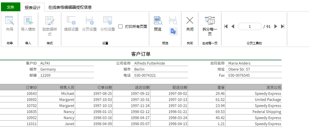 客户订单表 报表主体存在一对多关系; 只需设计一个报表模版,根据数据源可扩展出多个不同的客户订单表; 不同订单表需要支持分页展示。 |