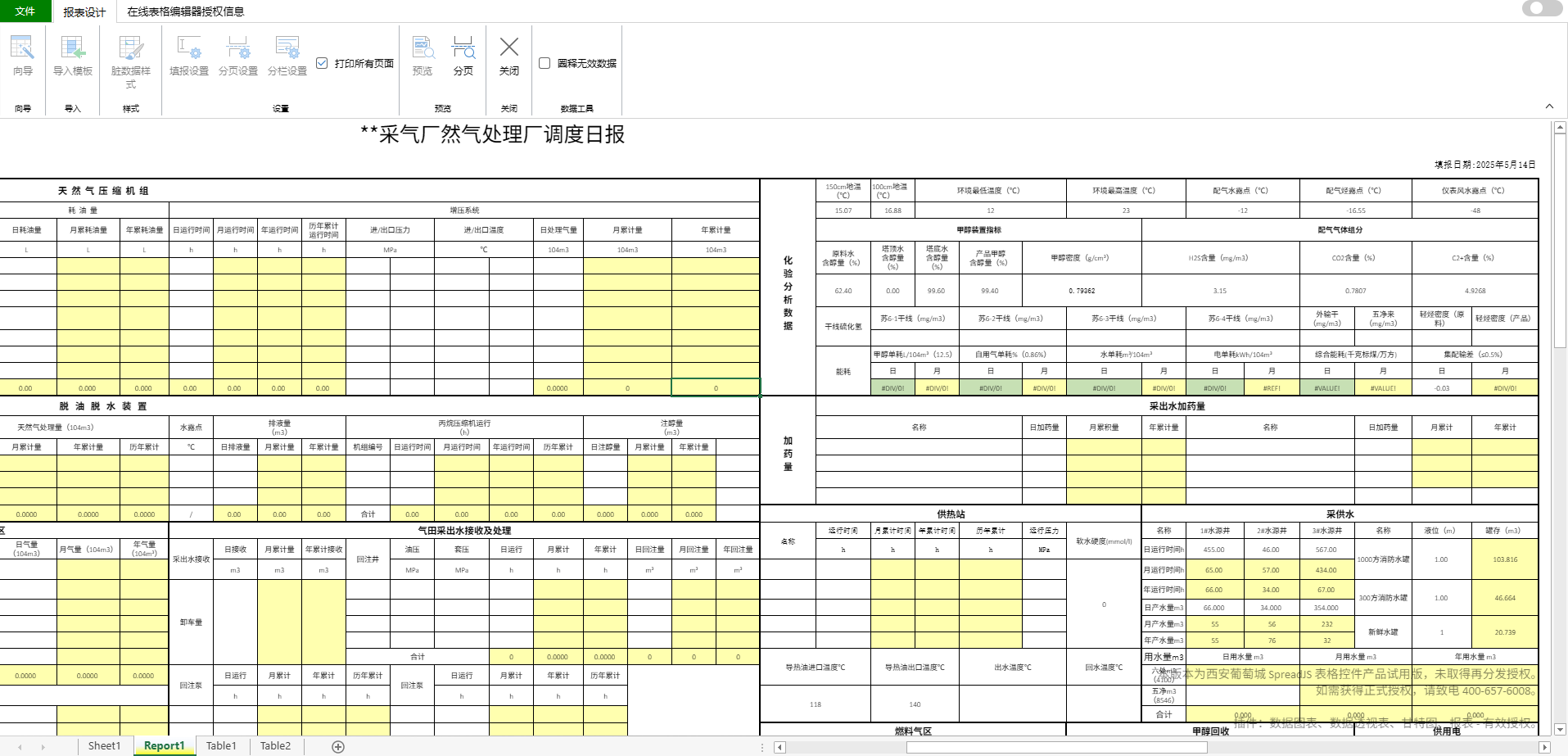 设备运行表 报表结构复杂,对接数据源时字段需要同时进行横纵向扩展; 历史报表均为Excel模版,需要复用历史模版,减少开发人员工作量; 只关注计算结果,报表预览时并不要求必须具备excel公式的引用高亮关系; |