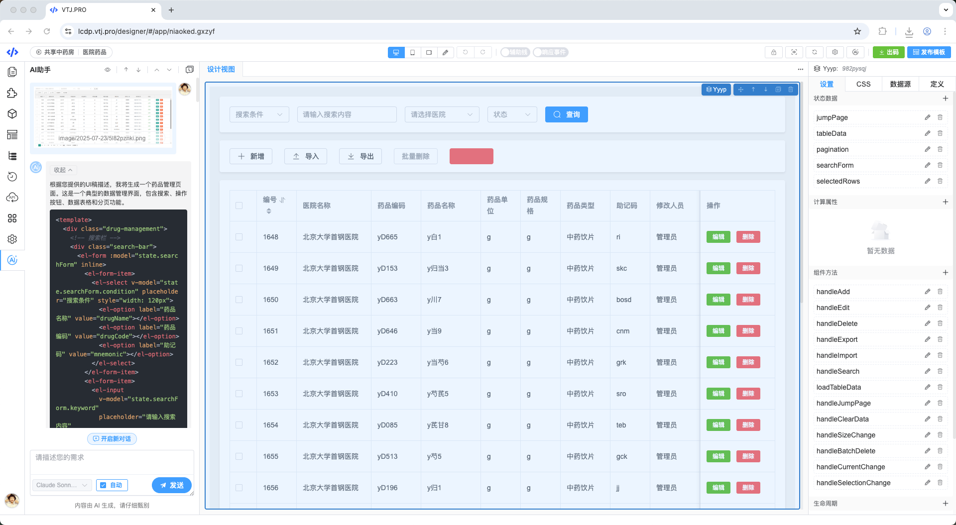 通过简单的属性配置,你可以设置表格的列和数据源,而无需编写大量模板代码。VTJ支持直接编写Vue组件代码,让你在享受低代码便利的同时不失去编码的灵活性。