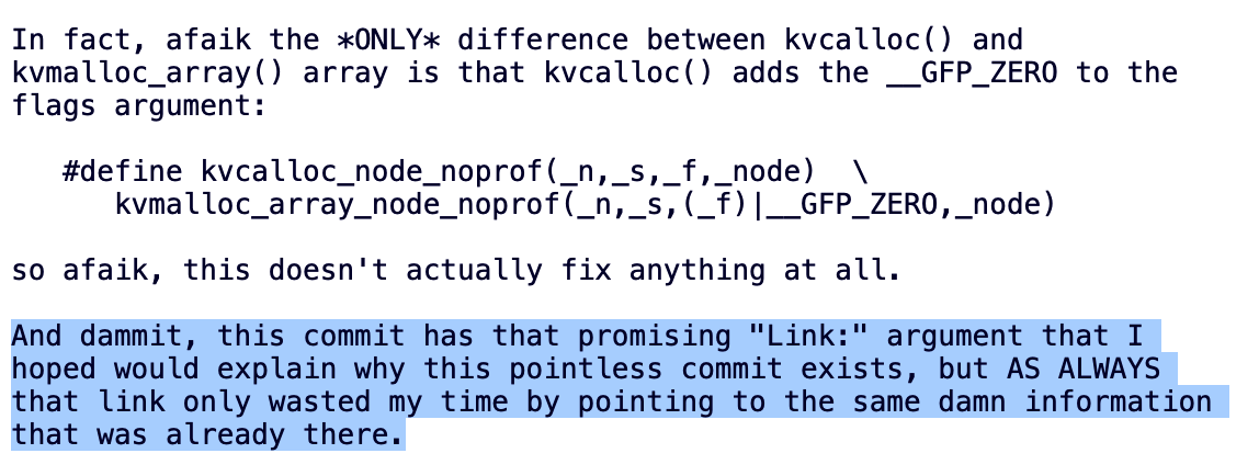 坦率地讲,就算这种讨论最终没有什么实质内容,我想只要这个链接至少指向某个帖子(而不是那些已经收集起来的acked-by邮件),我也会觉得没那么烦人,相比那种只是指向单封邮件、没人回复过的链接。至少这样我会觉得多少有点实际内容。