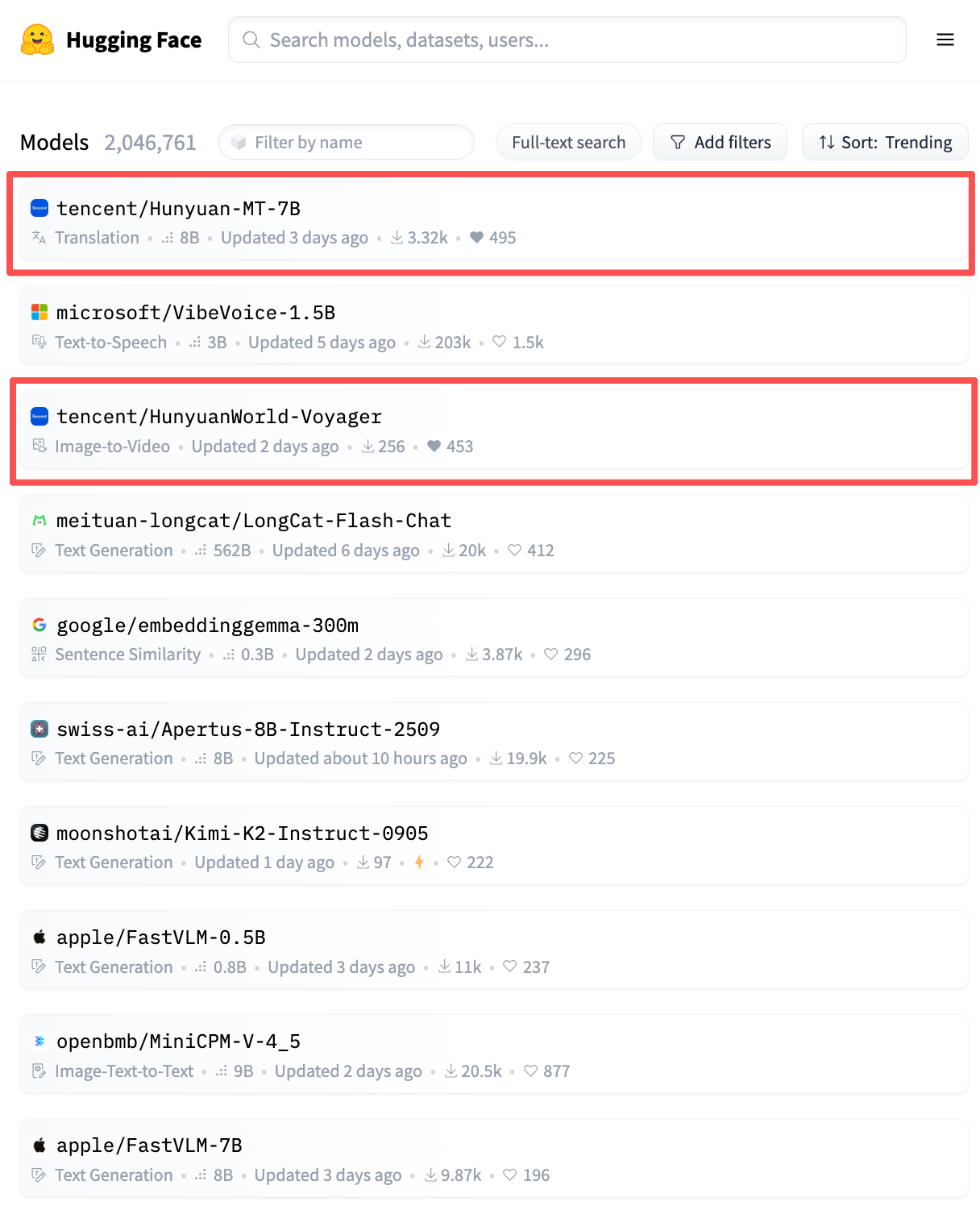 腾讯混元宣布,混元翻译模型Hunyuan-MT-7B登顶 Hugging Face模型趋势榜第一位。官方表示,该模型和混元世界模型家族最新成员HunyunWorld-Voyager一起,拿下前三中的两席。