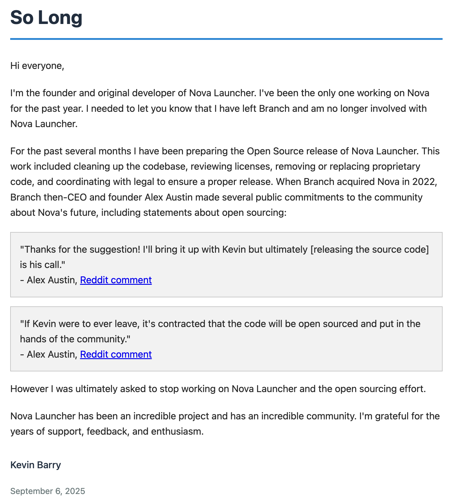 知名 Android 第三方桌面启动器 Nova Launcher 创始人和原始开发者 Kevin Barry 宣布,他已经离开收购 Nova Launcher 的分析公司 Branch,并不再参与该项目。