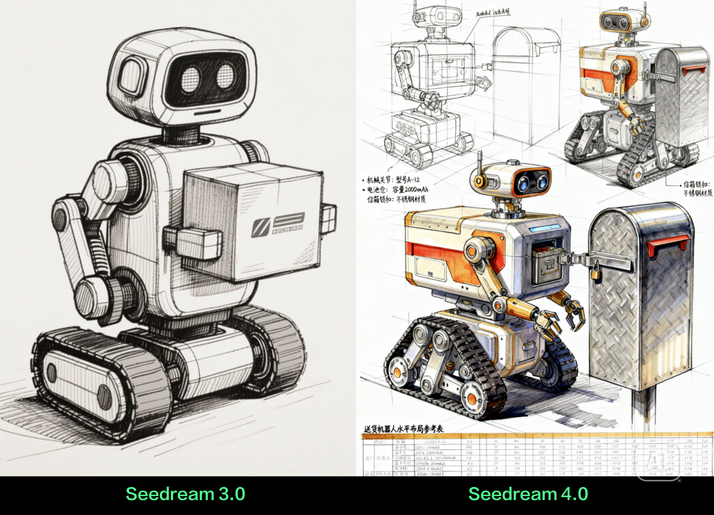 使用同样 prompt,分别用 Seedream 3.0 和 Seedream 4.0 生成送货机器人的手绘草图,Seedream 4.0 在文字渲染和排版上更精致。