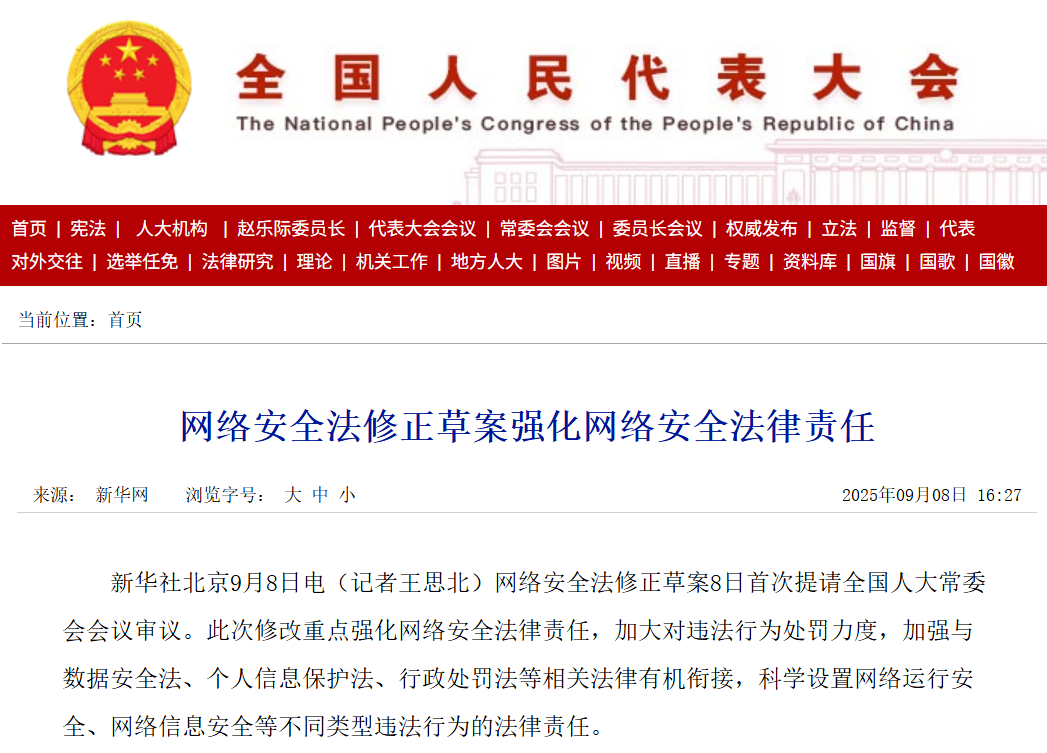 网络安全法修正草案8日首次提请全国人大常委会会议审议。此次修改重点强化网络安全法律责任,加大对违法行为处罚力度,加强与数据安全法、个人信息保护法、行政处罚法等相关法律有机衔接,科学设置网络运行安全、网络信息安全等不同类型违法行为的法律责任。