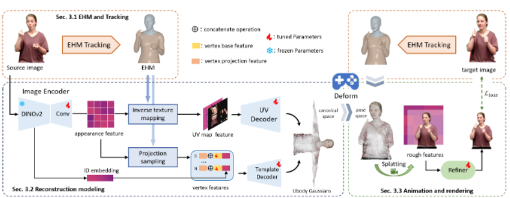 GUAVA 的优越表现得益于其创新的技术架构,主要包含两个关键组件:EHM 模型和3D 高斯泼溅。EHM 模型通过结合 SMPLX 和 FLAME 技术,确保了人脸表情的高保真度和精准控制,而3D 高斯泼溅则通过将场景拆分为数百万个3D 高斯球体,从而实现快速渲染。这种方法使得 GUAVA 在身份一致性上也表现出色,相关指标超过了竞争对手的水平。