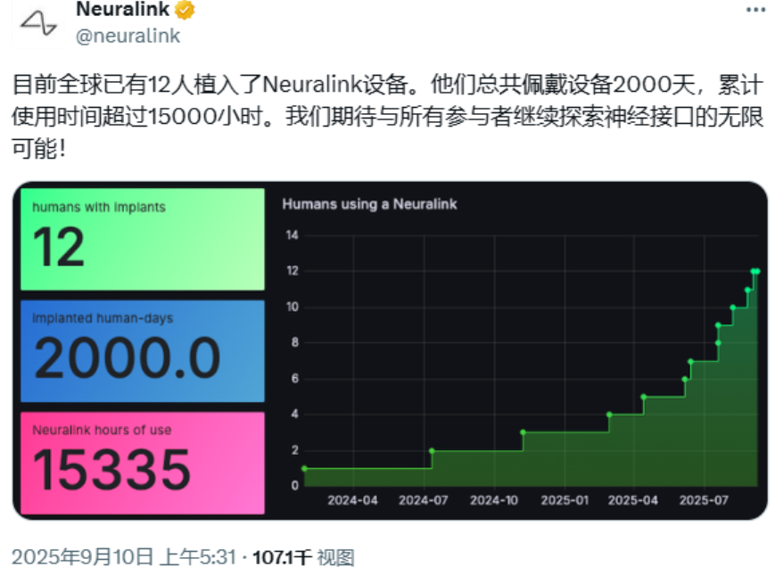 马斯克脑机公司 Neuralink:已为全球 12 人植入芯片