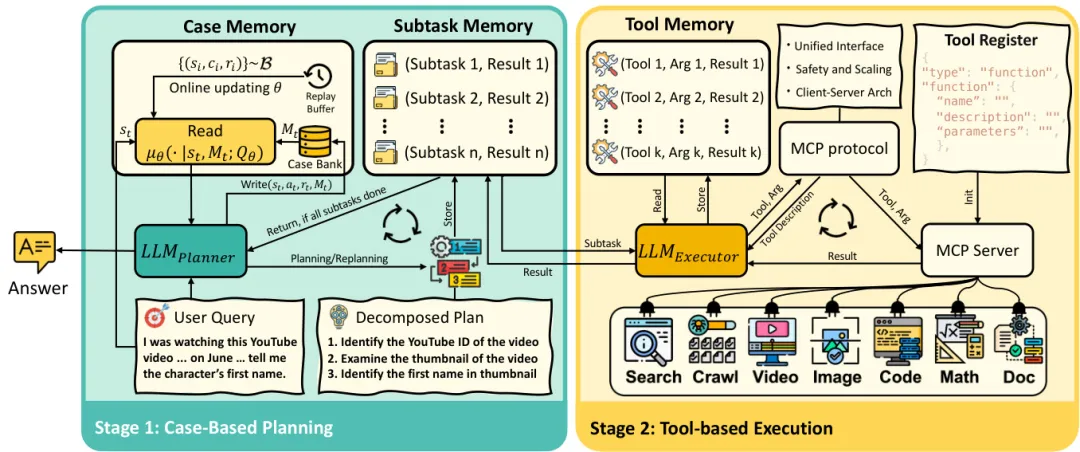 实验表明,该方法通过记忆库的持续更新实现高效在线学习,在复杂工具调用和多轮推理任务中展现出显著优势,为构建具备持续学习能力的通用型LLM代理提供了新范式。