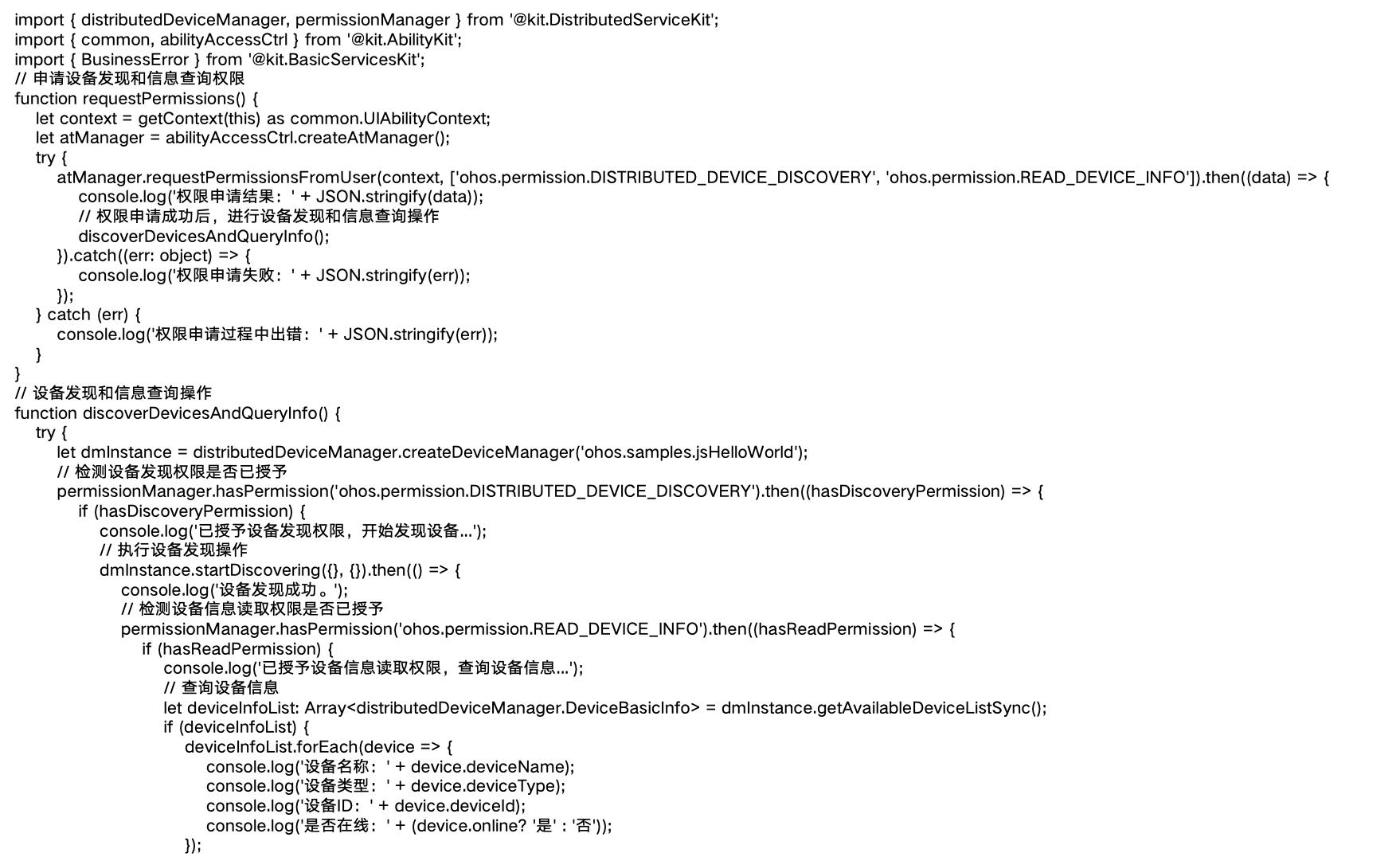 在这个示例中,首先定义了requestPermissions函数用于申请设备发现和信息查询权限,成功后调用discoverDevicesAndQueryInfo函数进行设备发现和信息查询操作。在discoverDevicesAndQueryInfo函数中,分别检测了设备发现权限和设备信息读取权限,根据权限情况执行相应的操作,并处理可能出现的错误。