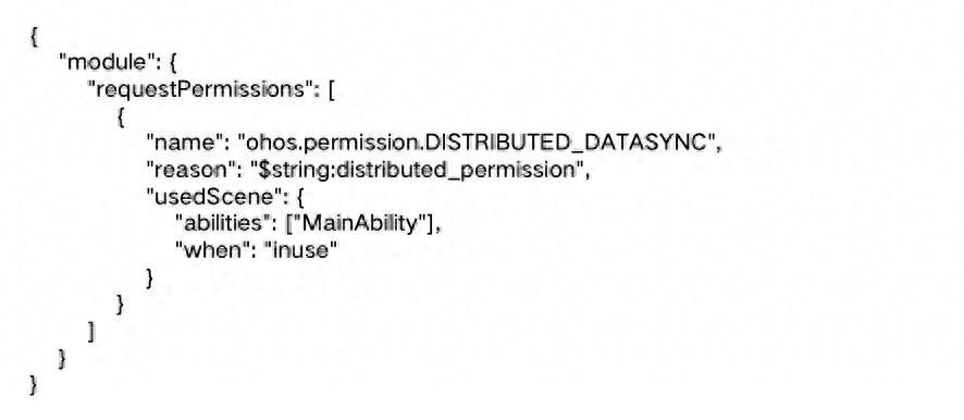 2. 在配置文件中声明权限:将所需权限在应用的配置文件(如module.json5)中进行声明。以申请分布式数据同步权限(ohos.permission.DISTRIBUTED_DATASYNC)为例,配置如下: