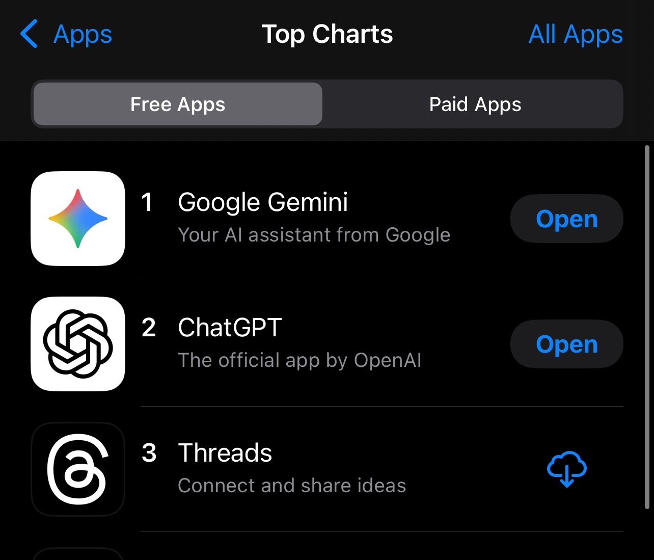 截至周五晚,Gemini位列美国App Store免费榜第一位,OpenAI的ChatGPT排名第二,社交应用Threads位居第三。Google搜索App排在第六,Google地图第八,Chrome第十三,Gmail则排在第二十一。