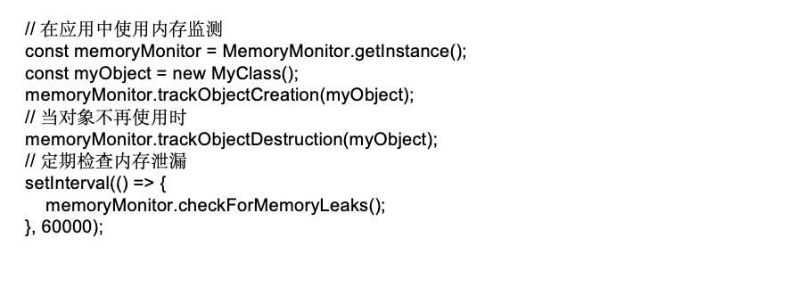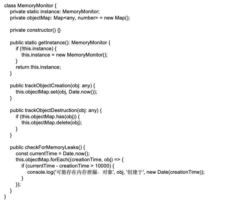 内存泄漏是影响应用性能和稳定性的严重问题。HarmonyOS NEXT提供了一些工具和技术来检测内存泄漏。例如,在DevEco Insight中,可以使用内存分析功能来查看对象的引用关系和内存占用情况。如果发现某个对象在长时间内一直占用内存且没有被释放,可能存在内存泄漏。另外,开发者也可以在代码中手动添加一些内存监测逻辑,如记录对象的创建和销毁时间,通过对比来判断是否存在内存泄漏。以下是一个简单的内存监测代码片段: