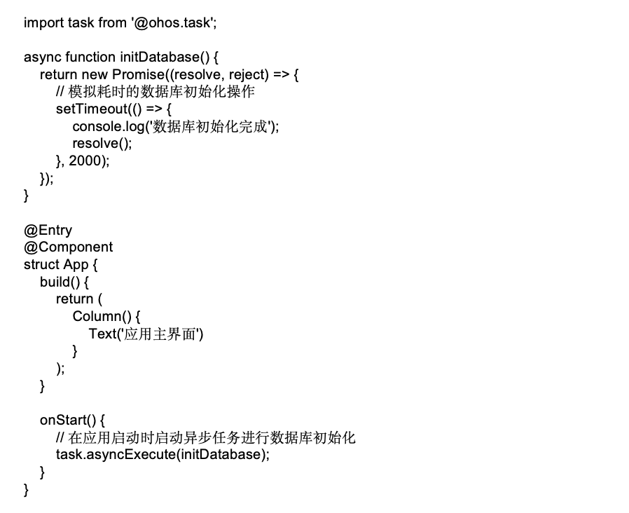 将耗时的任务放在异步线程中执行,避免主线程阻塞。例如,在应用启动时进行数据初始化,可以使用异步任务来完成。以下是一个使用异步任务进行数据库初始化的代码示例: