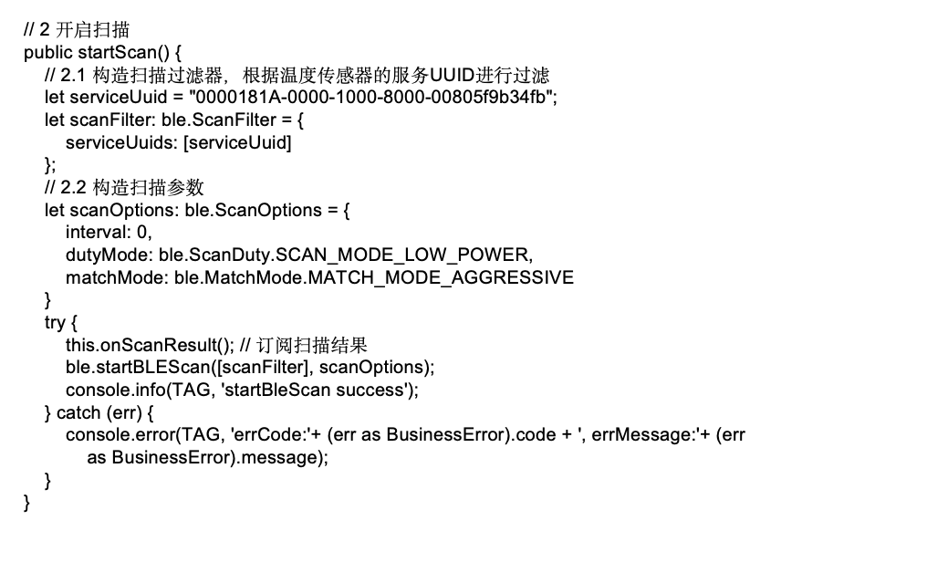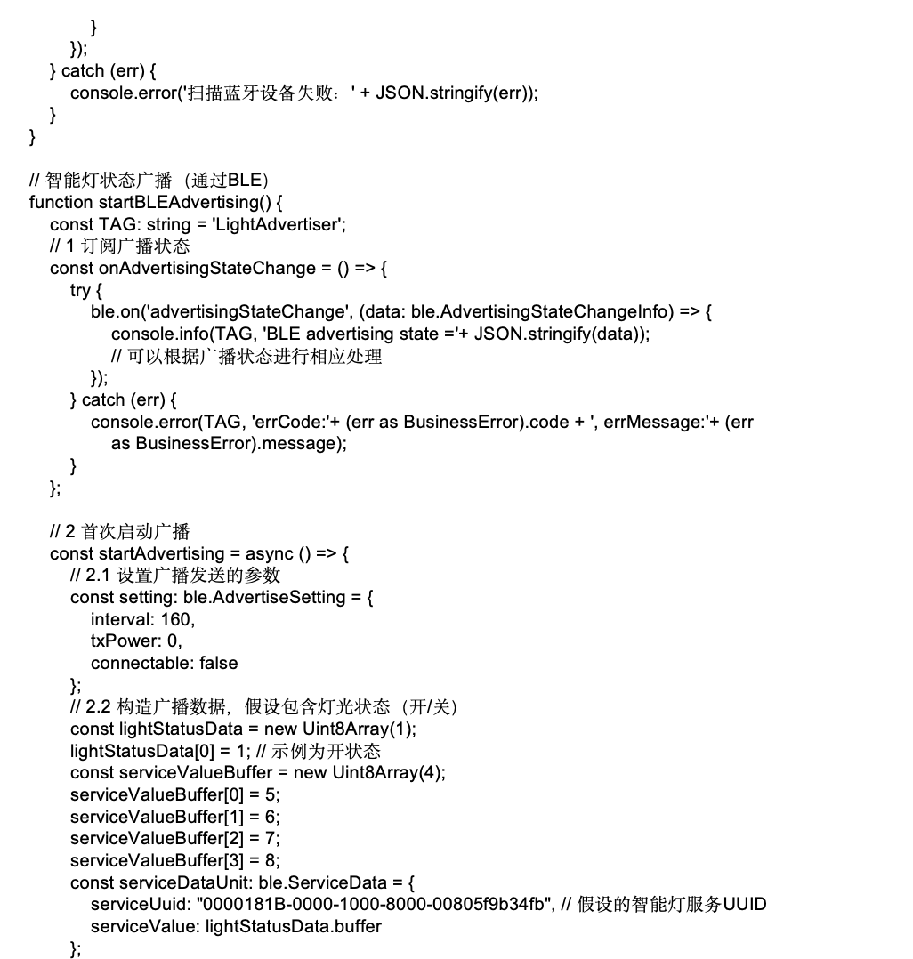 · 低功耗设备(如温控传感器)通过BLE广播自身状态信息,网关设备则开启BLE扫描,接收并处理这些信息。示例代码如下: