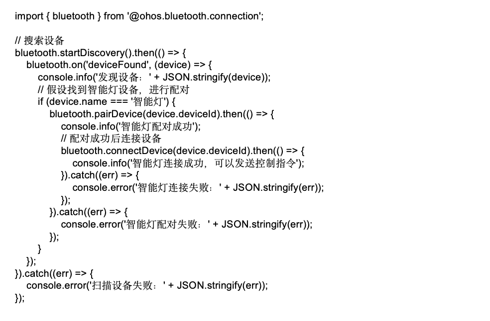 · 当需要对智能设备进行控制或获取更详细信息时,通过蓝牙连接API进行设备发现和配对操作。例如,手机APP可以搜索并配对智能灯,然后通过蓝牙连接发送控制指令。以下是简单示例代码: