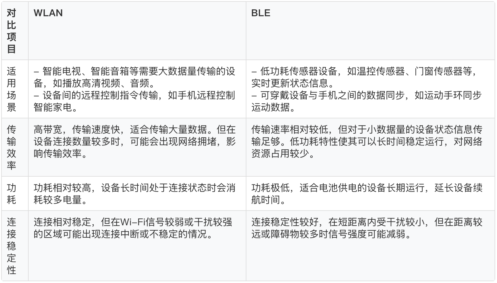 · WLAN提供了高带宽、稳定的网络连接,适用于大数据量的传输,如智能电视播放高清视频、智能摄像头传输视频流等。而BLE则以其低功耗特性,在设备状态更新等小数据量、低频次传输场景中表现出色,两者相辅相成,构建了高效的智能家居数据同步和管理网络。