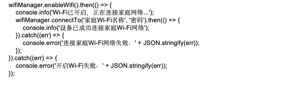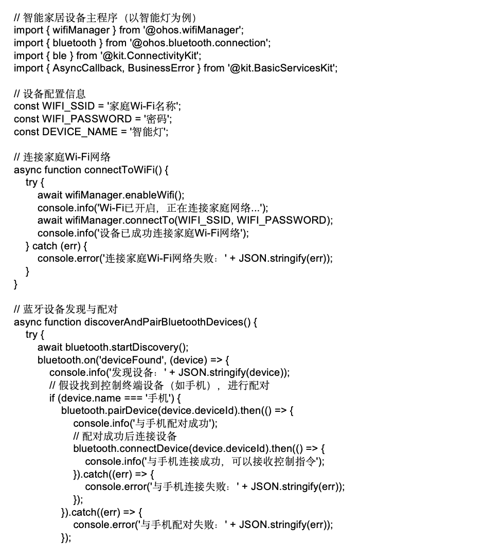 · 智能家居设备在启动时,通过相关API配置WLAN STA模式,自动搜索并连接家庭Wi-Fi网络。以下是简单示例代码(假设wifiManager为WLAN管理模块实例):