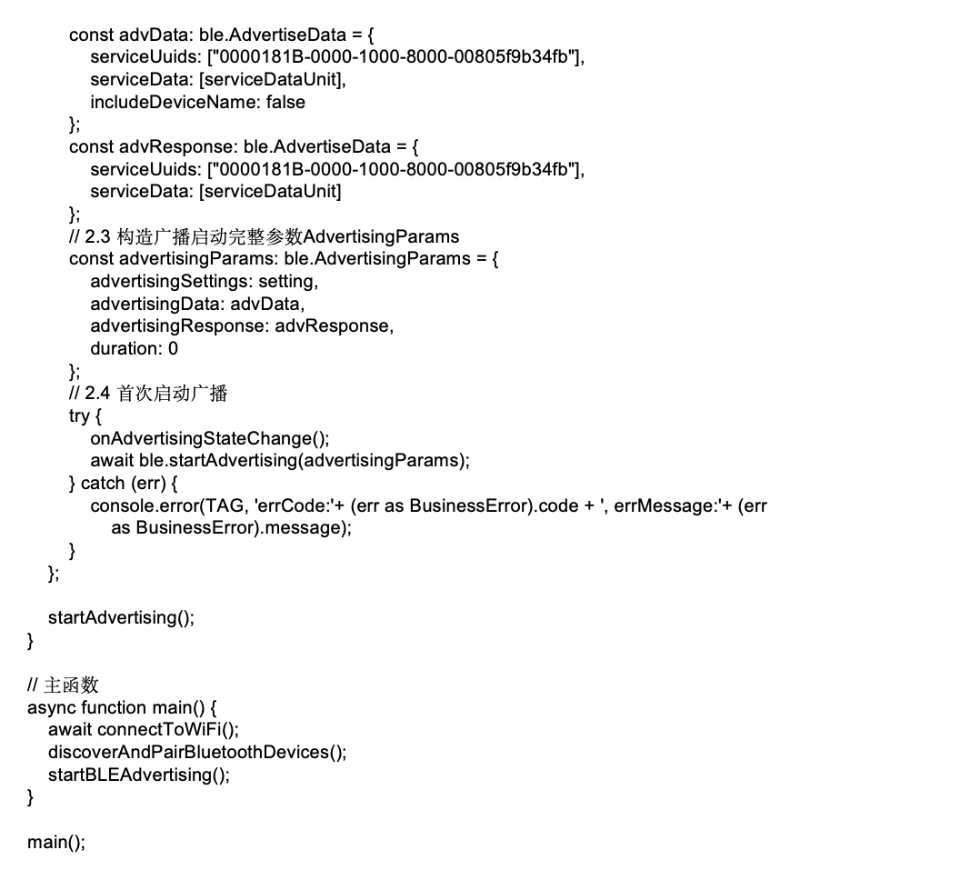 以下是一个更完整的展示WLAN和BLE联合使用的示例代码,包括设备配对、广播、数据传输等功能(部分代码片段参考前面实现步骤中的示例并进行整合):