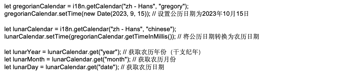· 在鸿蒙应用中,可以通过获取公历和农历日历对象,并设置相应的日期,实现公历与农历之间的转换。例如,将公历日期转换为农历日期:
