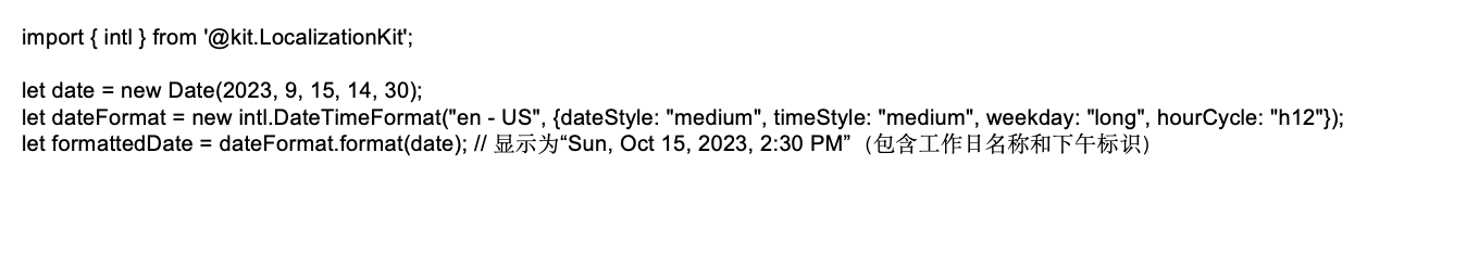 · 使用 DateTimeFormat 类时,通过设置相关参数来控制本地化元素的显示。例如,设置 weekday 参数来显示正确的工作日名称(如“long”表示完整名称,“short”表示缩写名称),在12小时制下设置 hourCycle 参数来显示正确的上午/下午标识(如“h11”或“h12”)。例如: