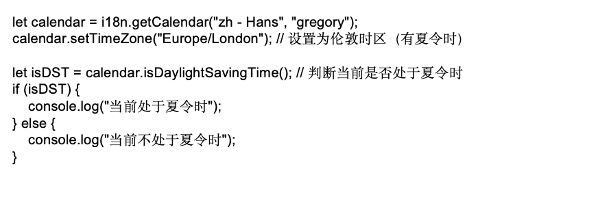 · 鸿蒙系统会自动处理夏令时相关的时间调整,开发者需要确保在获取和显示时间时,使用的是系统正确处理后的时间。在存储和传输时间数据时,同样可以使用0时区标准时间(UTC或GMT),以避免夏令时带来的影响。如果应用需要在界面上显示是否处于夏令时状态,可以通过日历对象获取相关信息(如某些日历对象可能提供判断当前是否处于夏令时的方法),并告知用户。例如: