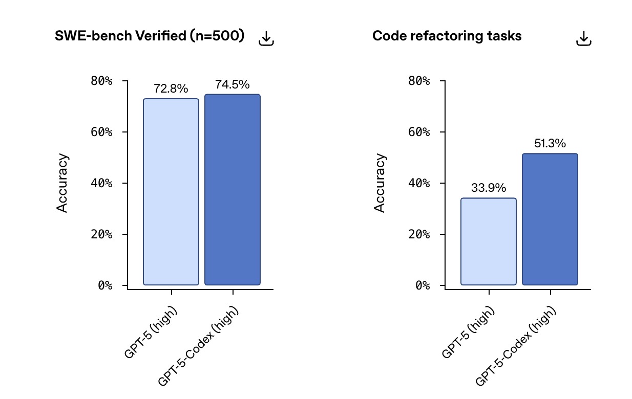 据介绍,GPT‑5‑Codex 已成为 Codex 云端任务与代码审查的默认模型,开发者也可通过 Codex CLI 或 IDE 插件在本地使用。与通用版 GPT‑5 相比,新版本在代码重构任务的准确率从 33.9% 提升至 51.3%,高影响力审查评论比例也从 39.4% 提升至 52.4%。