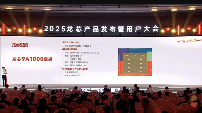 龙芯表示,9A1000 的速度比 2K3000 处理器内置的集成显卡 LG200 快 4 倍。9A1000 还提供高达 40 TOPS 的 AI 计算能力,略低于 AMD Ryzen AI Max+(代号 Strix Halo)芯片内置的 XDNA 2 NPU(高达 50 TOPS)。