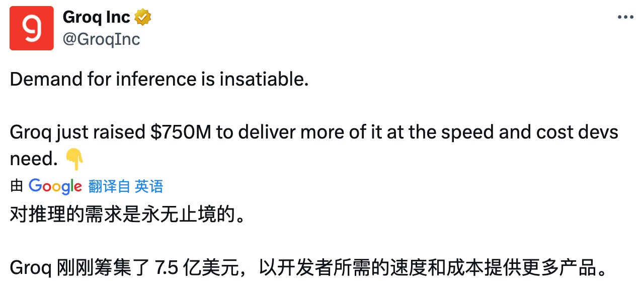 AI推理领域明星创企Groq宣布完成7.5亿美元新一轮融资,投后估值达69亿美元。