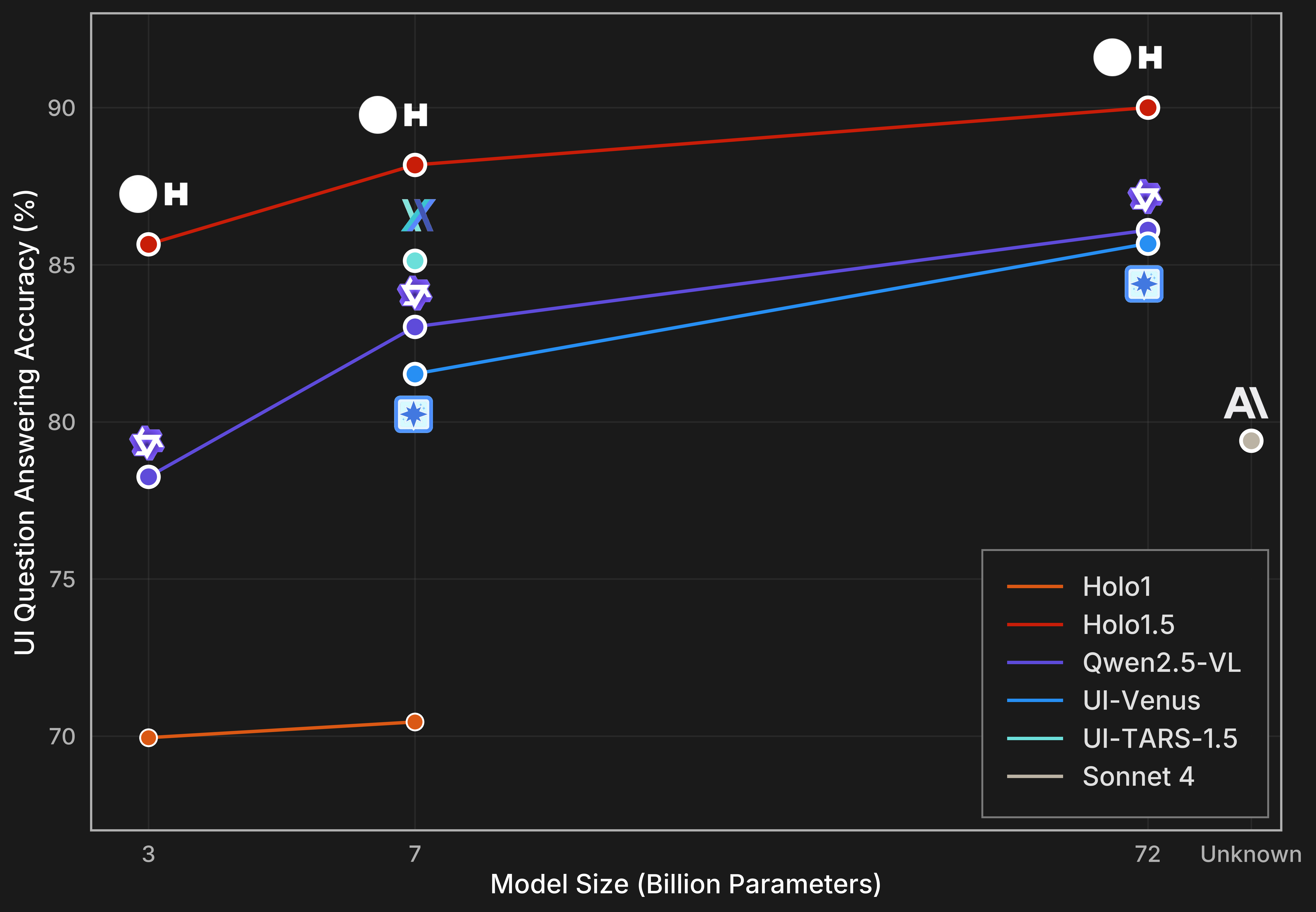 新系列在UI元素定位与界面问答任务上全面超越了前代 Holo1,平均准确率提升超过10%,并在Web、桌面、移动跨平台基准测试中刷新了开源模型的纪录。