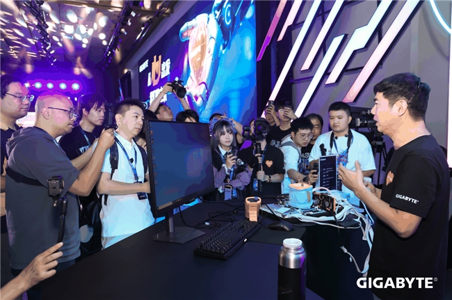 在产品展示区,技嘉以产品墙和MOD整机等形式陈列多套产品,其中,技嘉B850M AORUS ELITE WIFI7 ICE-P “雕妹” 主板以国风祥云纹路设计,成为现场 “颜值爆款”;技嘉X870I AORUS PRO ICE 迷你冰雕则凭借纯白 ITX 板型,将为小型主机玩家的优质选择。