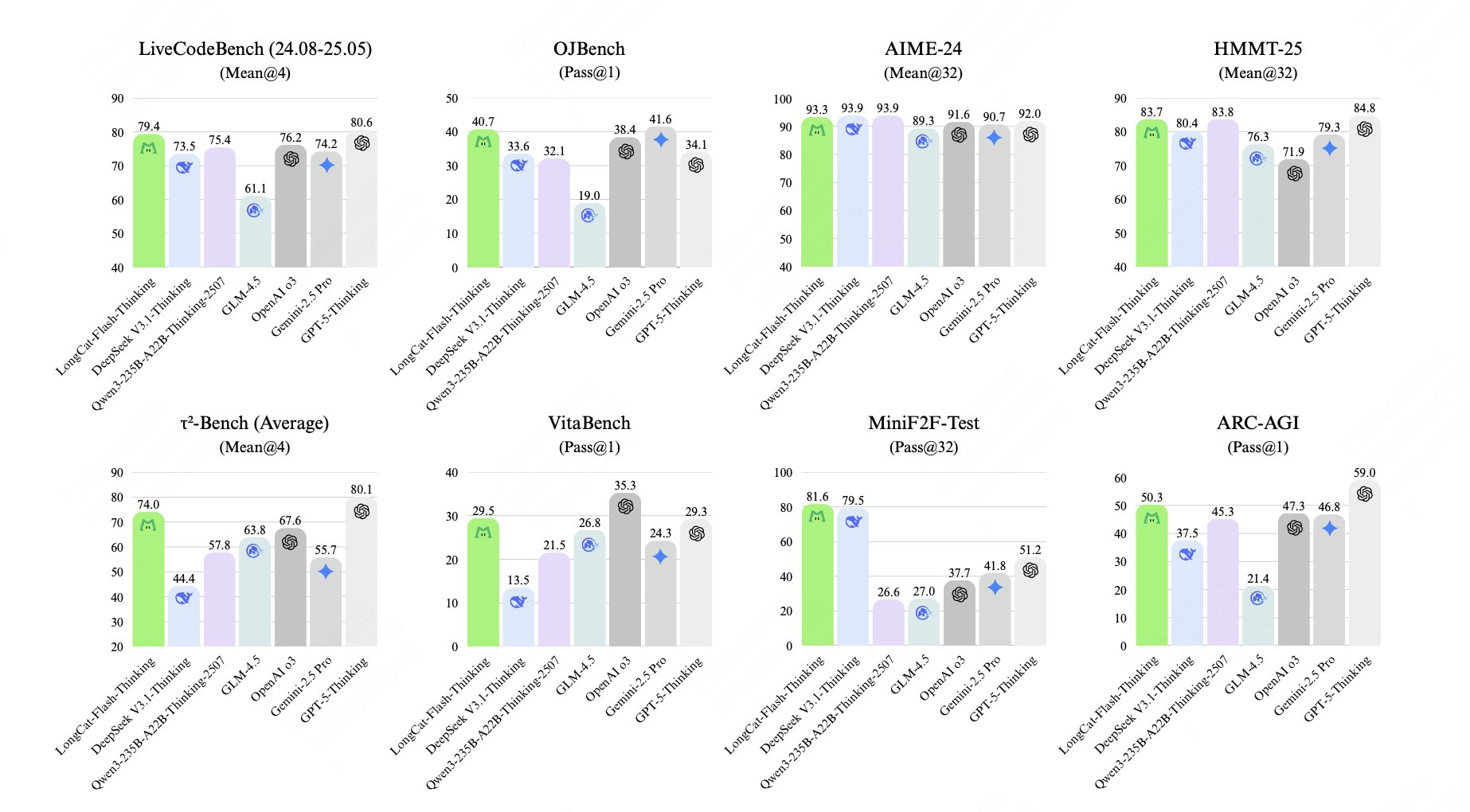根据官方公布的评测结果,LongCat-Flash-Thinking在多个基准测试中与其他主流模型进行了对比,在数学推理(如MATH500, AIME25)、通用推理(如GPQA-Diamond)、代码生成(如LiveCodeBench, OJBench)、Agent工具使用(如SWE-Bench, τ²-Bench)以及形式化定理证明(如MiniF2F-Test)等取得了接近领先模型的水平。