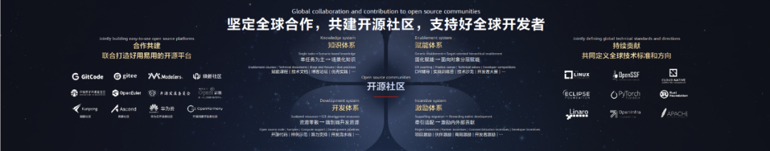 首先,坚定开源开放。华为既是开源的使用者、受益者,也是坚定的支持者与践行者,坚持将长期积累的软件能力持续回馈开源社区。华为是全球 20 多个开源基金会的创始成员或顶级成员,并在 300 多个上游社区中成为核心代码贡献者。