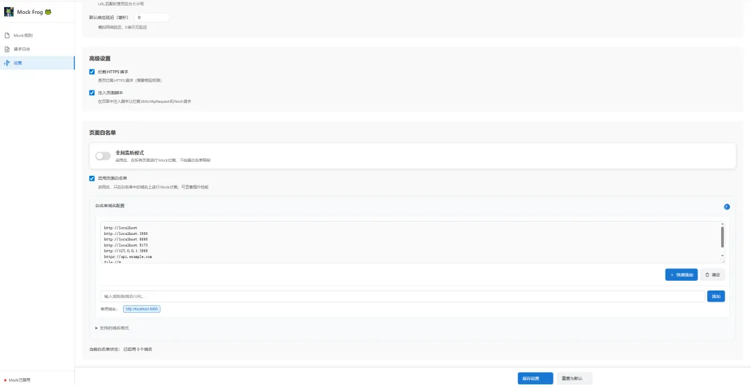 作用:针对所有页面都进行拦截可能会导致页面卡顿,影响整体性能,于是增加了白名单控制,控制 Mock 功能在哪些场景下才生效。同时也提供了全局生效模式,方便快速操作。