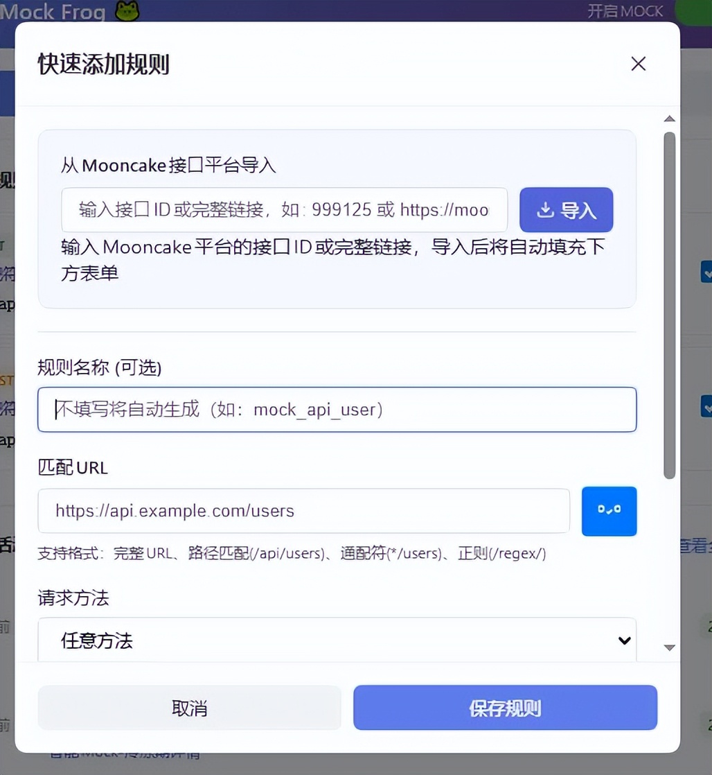 方式二:复制接口地址到匹配 URL 输入框中自行配置数据,这一步建议到管理规则中才施展的开。