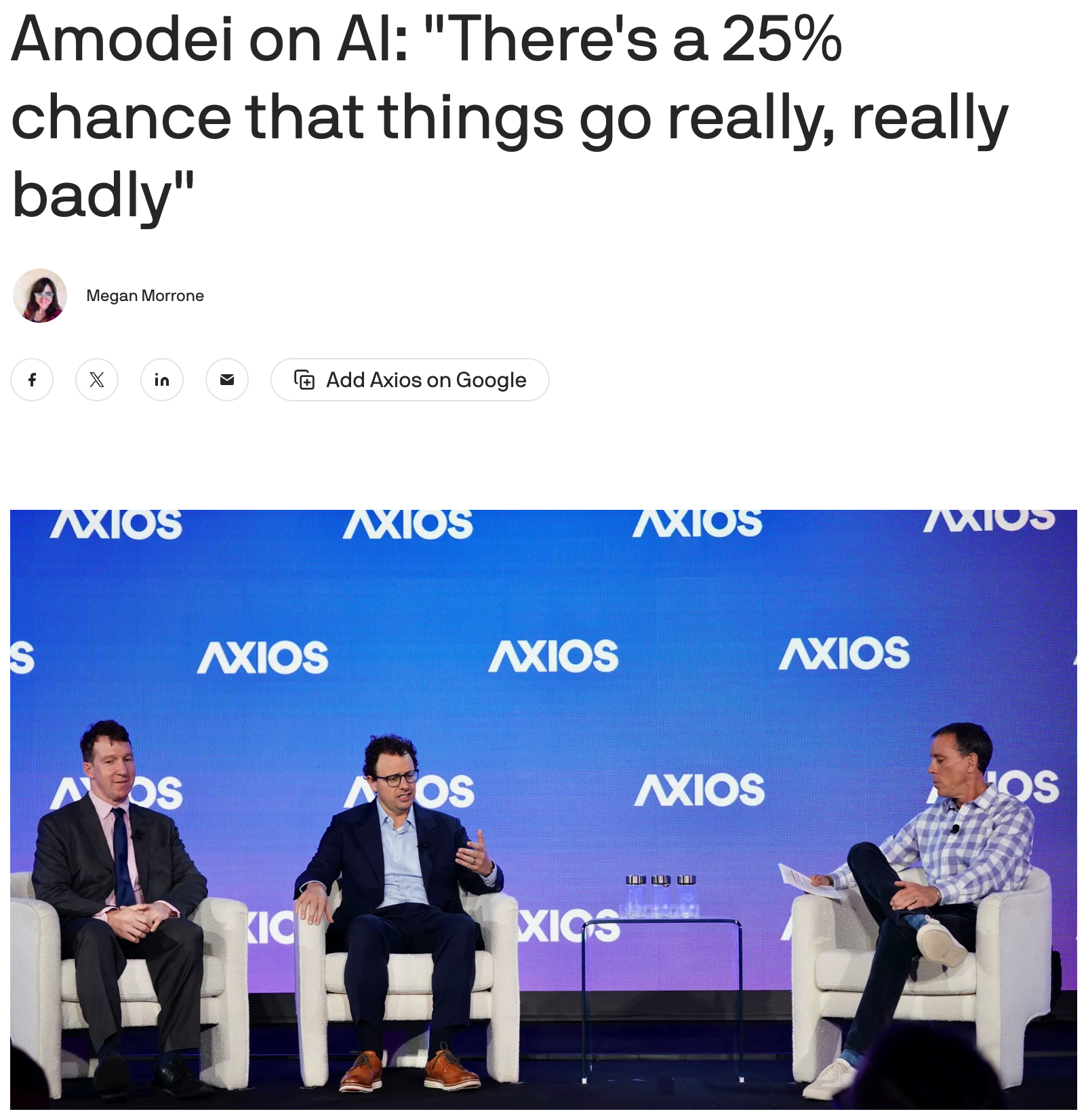 Axios 报道称,在华盛顿举行的 AI + DC 峰会上,Anthropic 首席执行官 Dario Amodei 表示,人工智能未来有“25% 的概率会发展得非常非常糟糕”,甚至可能导致人类灭绝。
