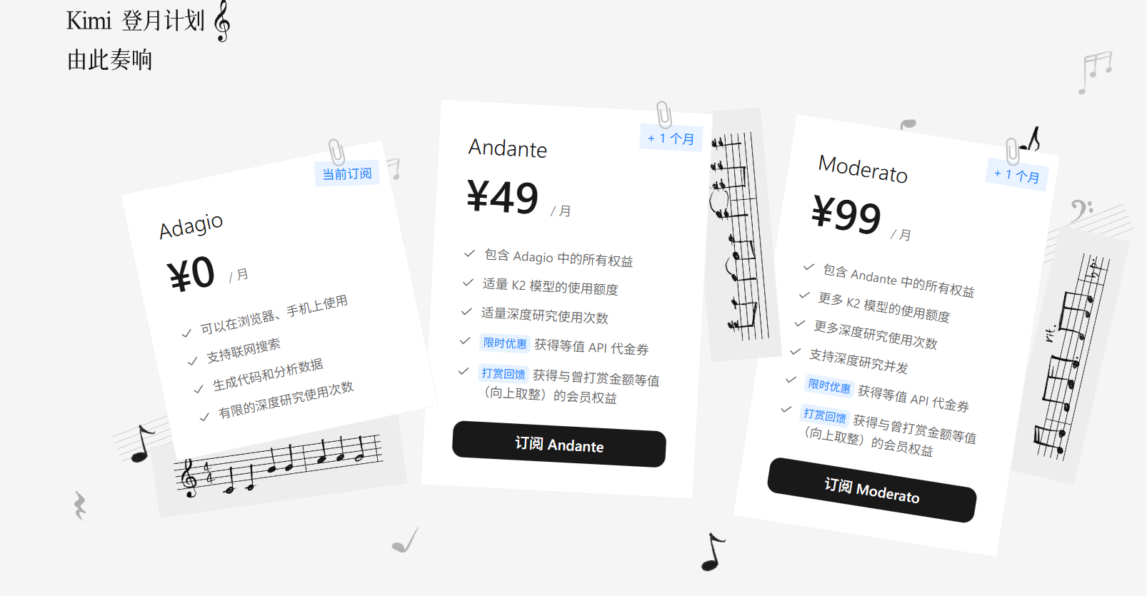 - Andante(行板)49 元中档订阅,更多的 K2 和深度研究额度,另外会送等额 API 兑换券。