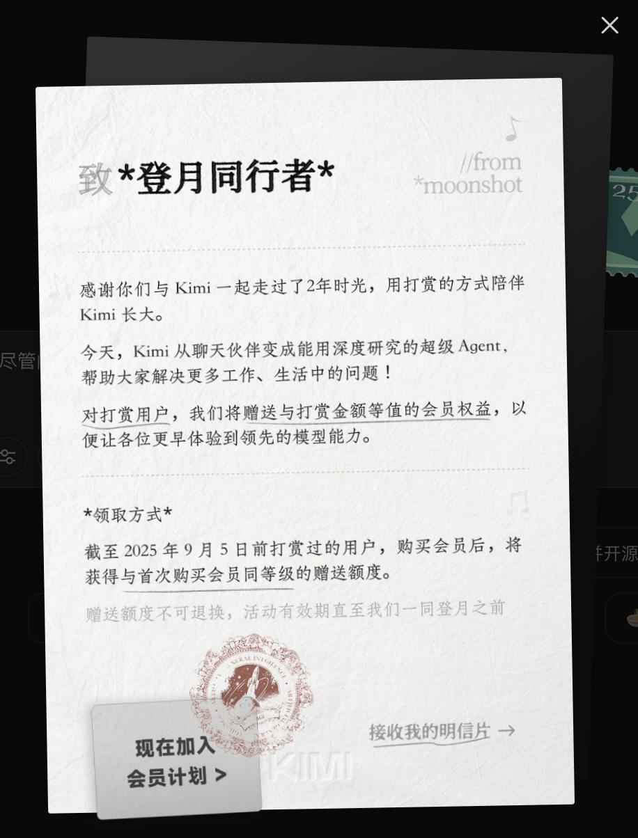昨晚,多位用户在打开Kimi界面时,意外收到一封感谢信,专为此前打赏的用户量身定制福利:订阅会员后,打赏金额将全额转换为会员时长。