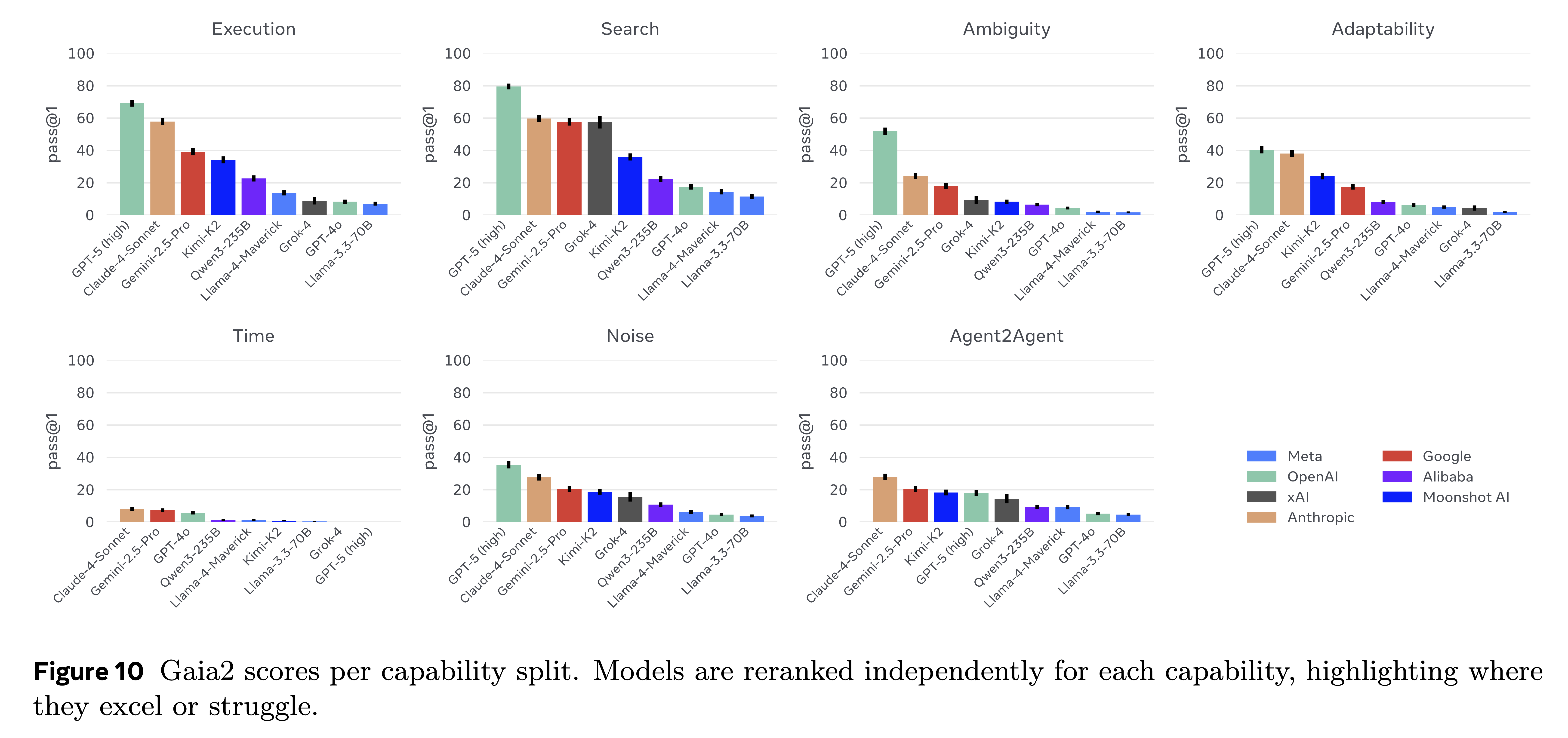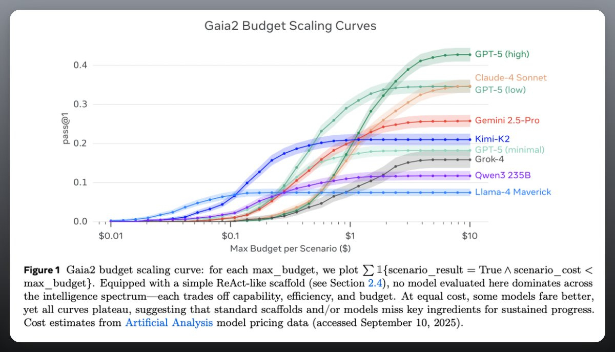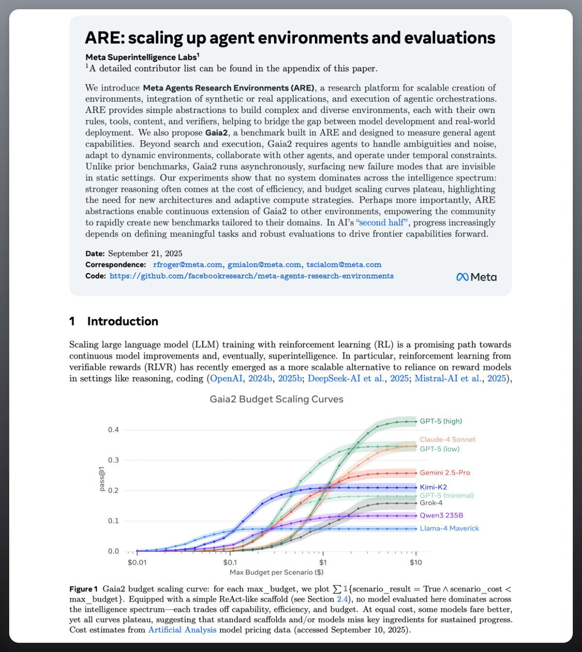 Meta发布了新一代Agent评测基准Gaia2及配套开源框架Meta Agents Research Environments(ARE),提供了1120个手机应用级的真实场景、多维度能力测试以及公开排行榜,旨在推动社区研究更稳定、可复现的AI Agent。