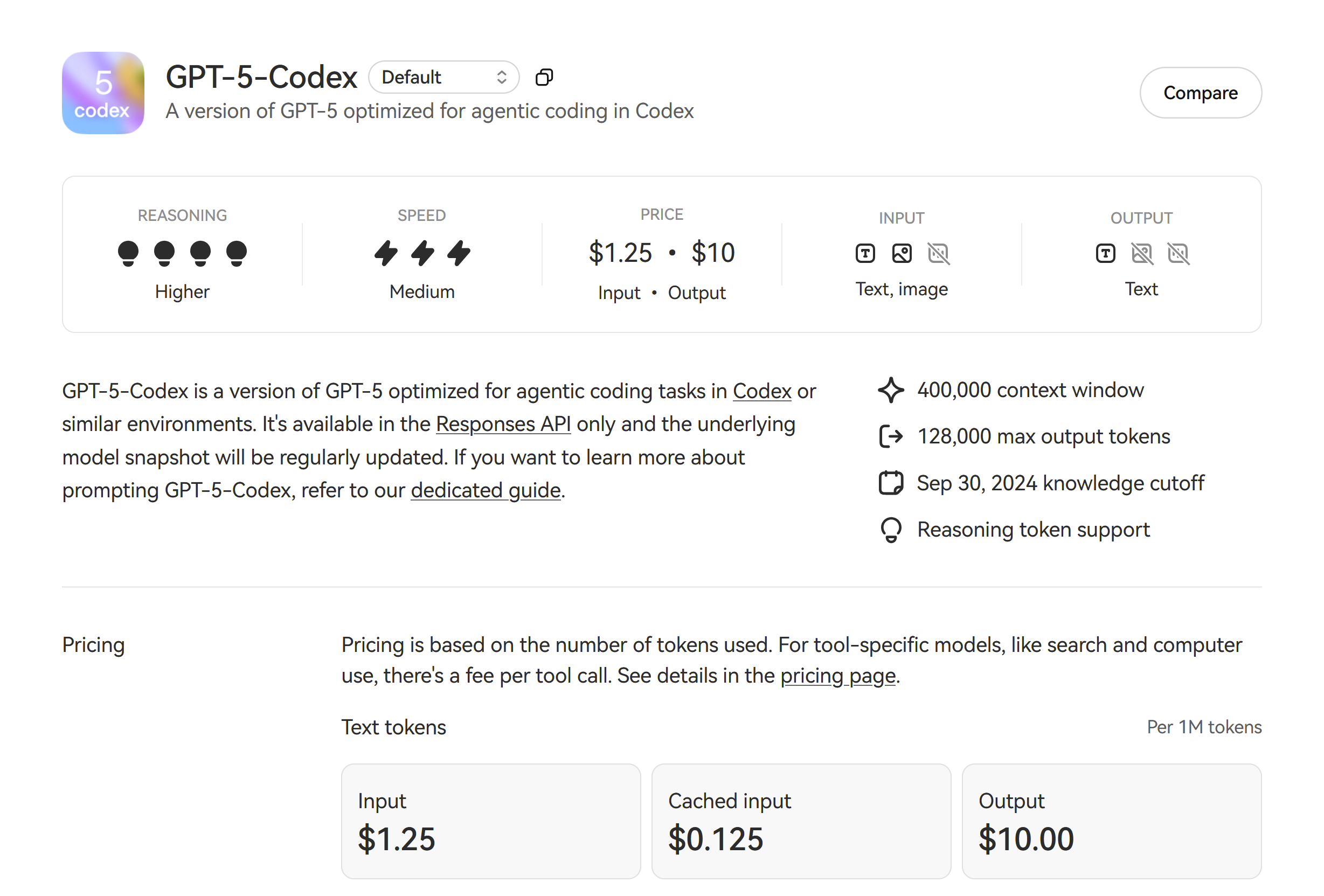 GPT-5-Codex模型拥有400k上下文窗口,知识截止日期为2024年9月30日,并已集成到多个开发平台。
