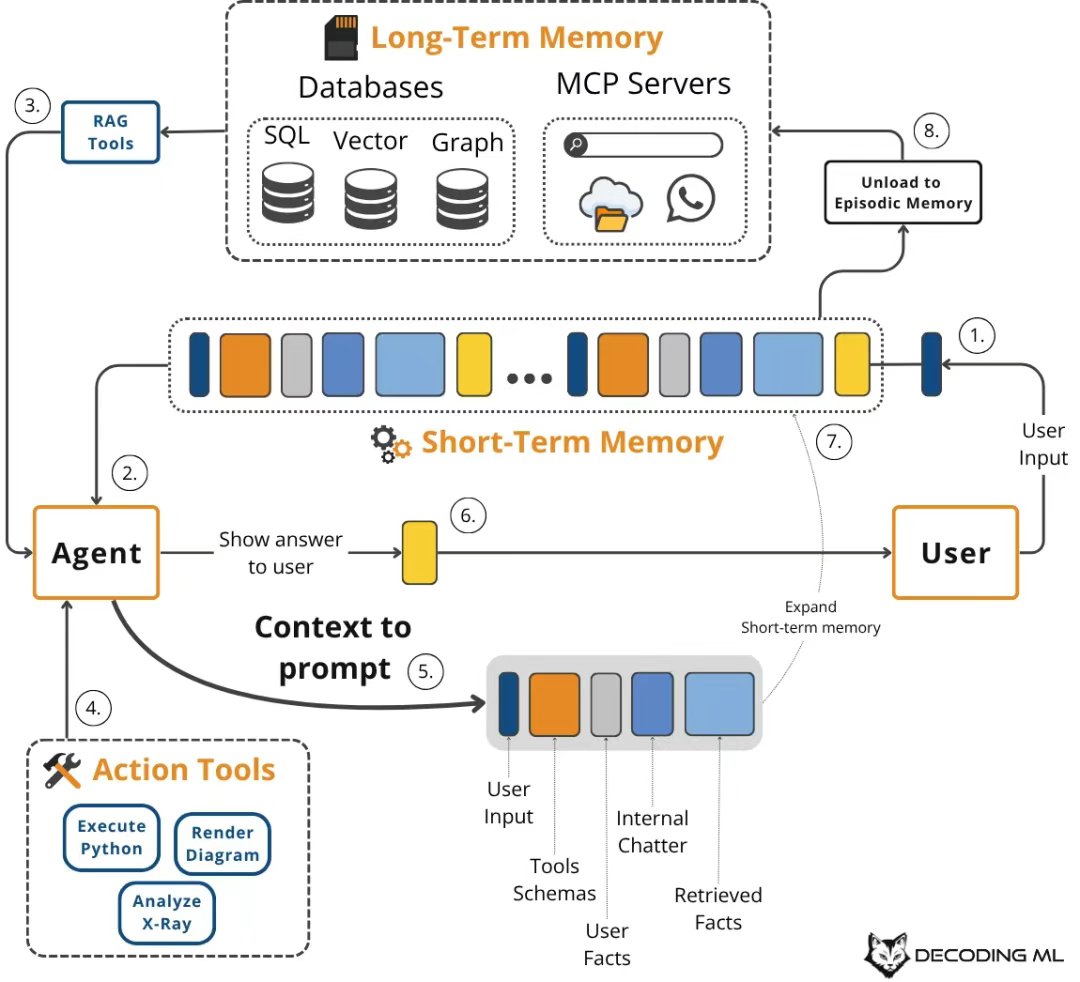 随后,我们将这些信息与短期工作记忆、工具模式及结构化输出模式相结合,为本次 LLM 调用创建出最终的上下文。LLM 的响应会更新工作记忆,并可能将关键信息写回长期记忆,从而优化系统以适应未来的交互。