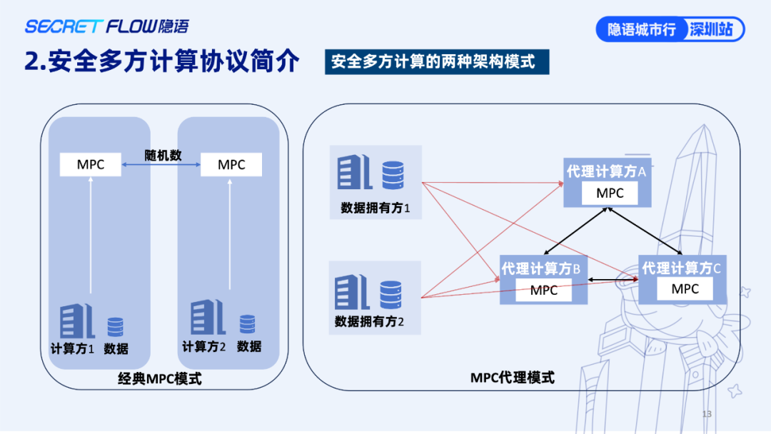 左边是最经典的安全多方计算的计算架构,简单理解为我们的计算方一和计算方二的原始数据并没有出来,它是以随机数的形式在 MPC 的组件之间进行交互。传统的安全多方计算模式虽然经典,但受到理论上的限制,性能上一直存在瓶颈。