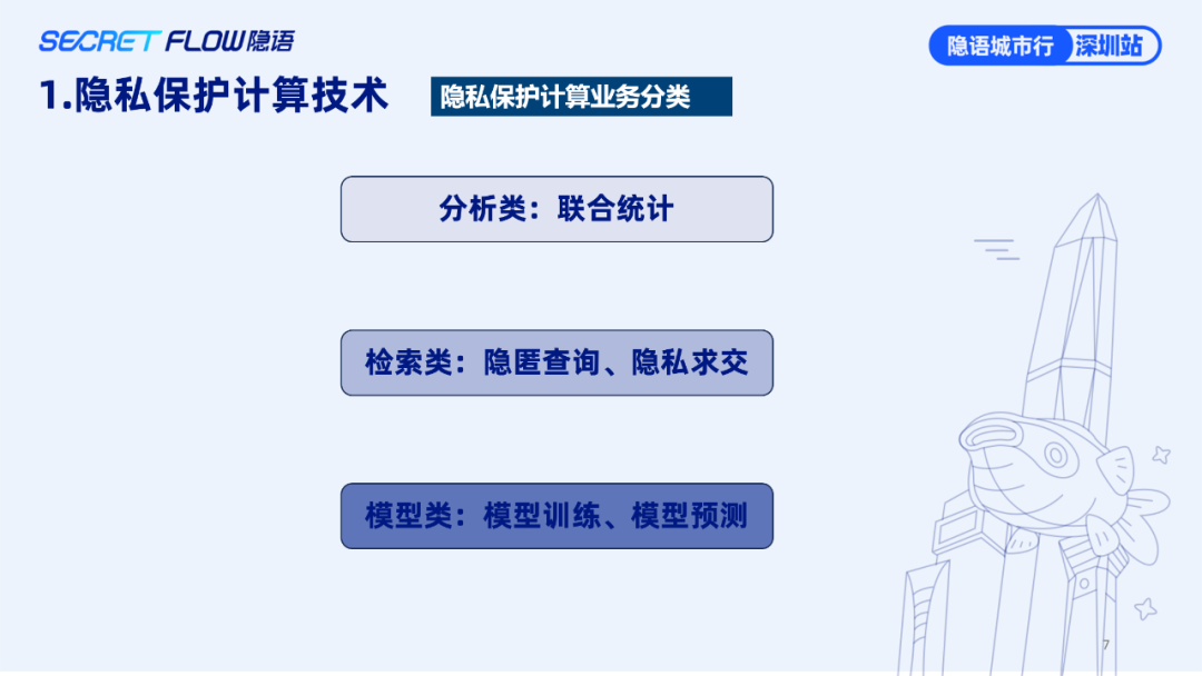 除了技术路线上的分类,我们还可以从业务角度对隐私保护计算进行分类,如分析类、检索类和模型类,分析类包括联合统计等,检索类包括查询等,模型类则与AI关系最大,包括模型训练和模型预测。