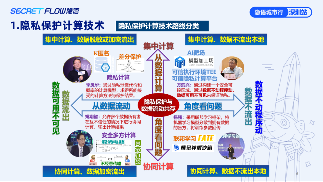 中间的纵轴是从数据计算的角度,就是参与方是集中式的计算还是协同式的计算,从这两个维度把现在的技术路线分成了四个象限。
