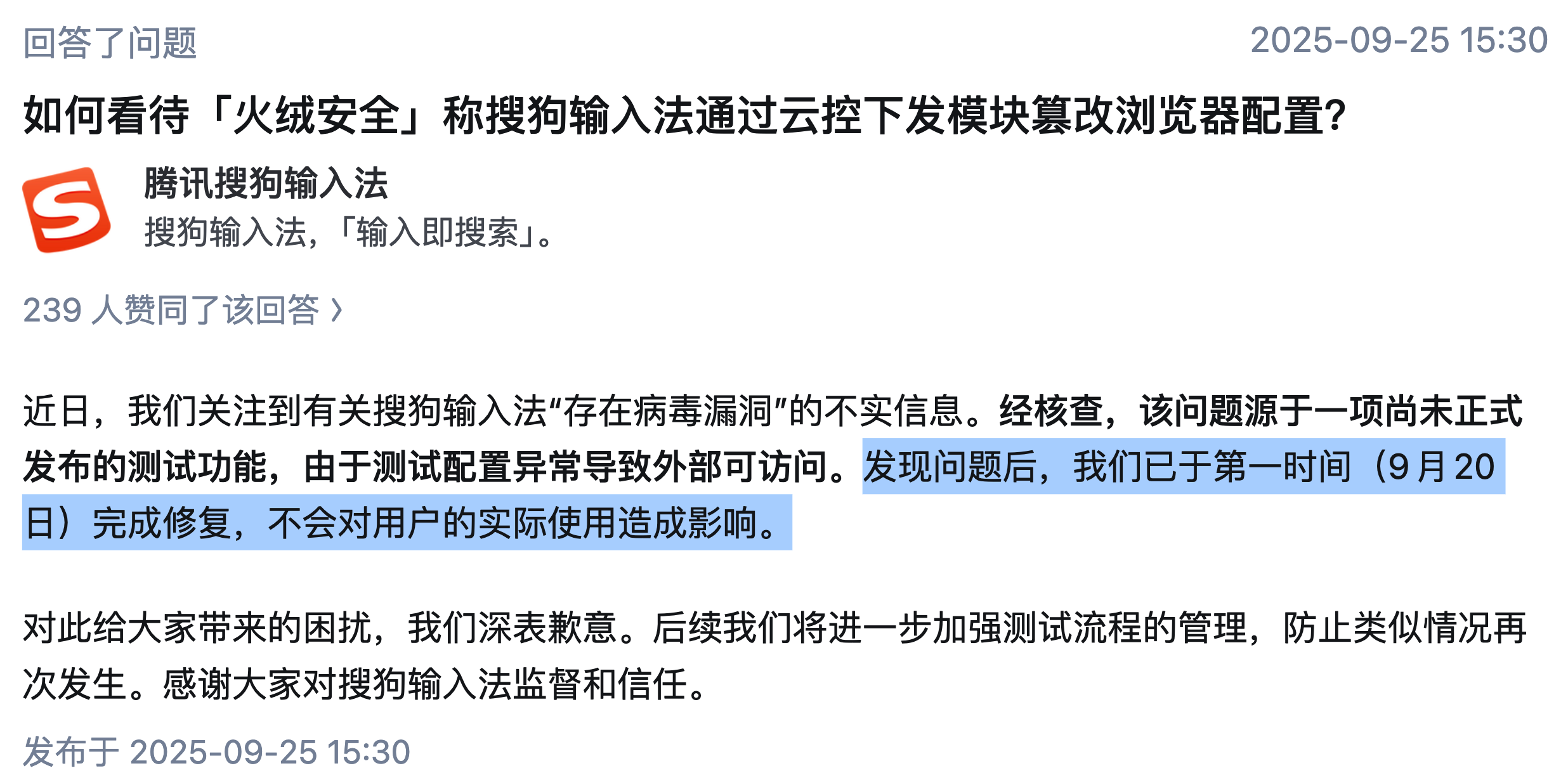 搜狗输入法回应被指“暗中篡改浏览器配置”:测试功能异常导致,已修复